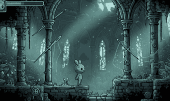 봉제인형 형태의 주인공 캐릭터가 황폐하고 버려진 듯한 교회 내부를 탐험하는 모습입니다. 배경의 거대한 바늘과 단추 디테일은 독특한 세계관을 암시하며, 어두운 톤의 2D 아트는 소울류 장르의 특징인 고독함과 긴장감을 전달합니다.